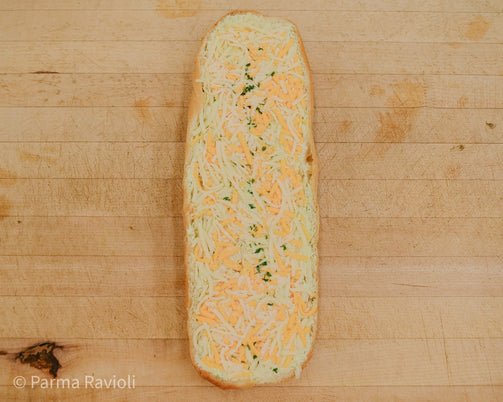 Italian Loaf, Garlic Spread (Margarine, Garlic, Italian Flat Leaf Parsley, Green Onions, and Garlic Powder), Cheddar Cheese, Mozzarella Cheese, Padano Cheese, Dried Parsley